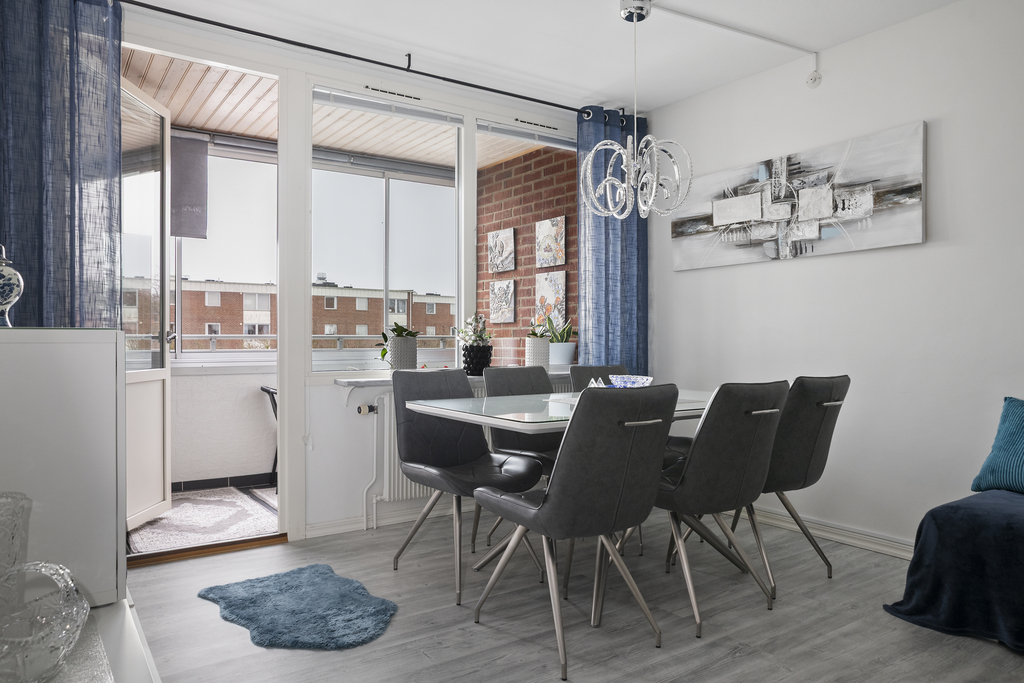 Stort och ljust rum med gott om plats för både soffan och matgruppen. Härifrån når vi balkongen med klinkergolv.